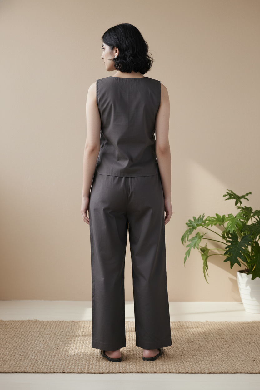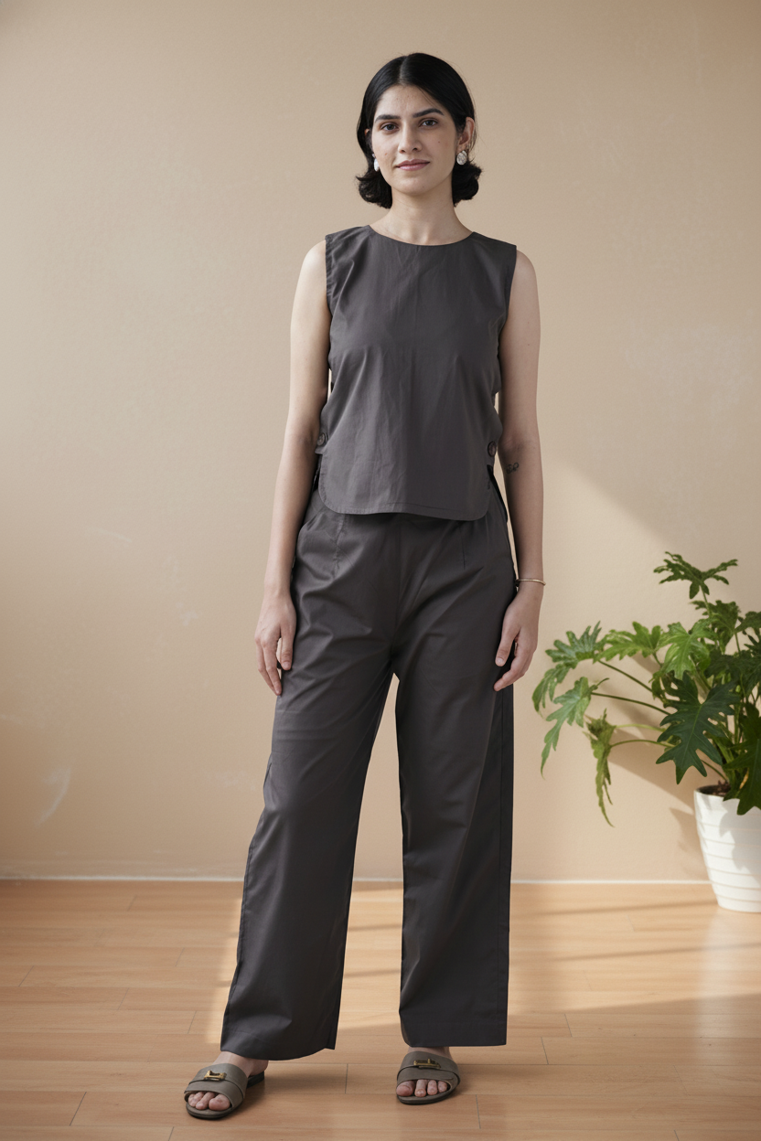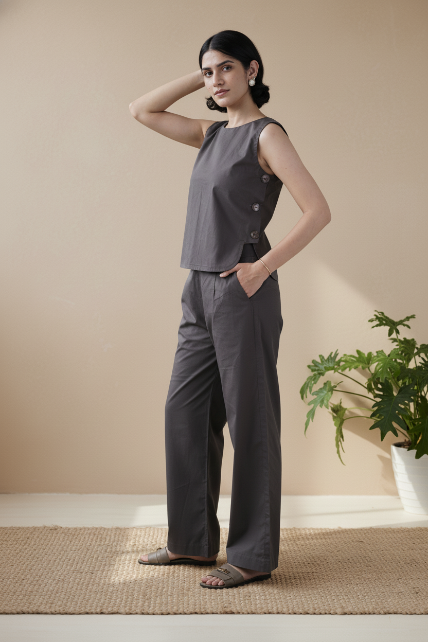 The Tosta Set brings quiet utility to soft tailoring. Made from crisp organic cotton poplin and finished in ash coffee, it features a co-ord silhouette with a side-button opening — functional, intentional, and minimal in expression.