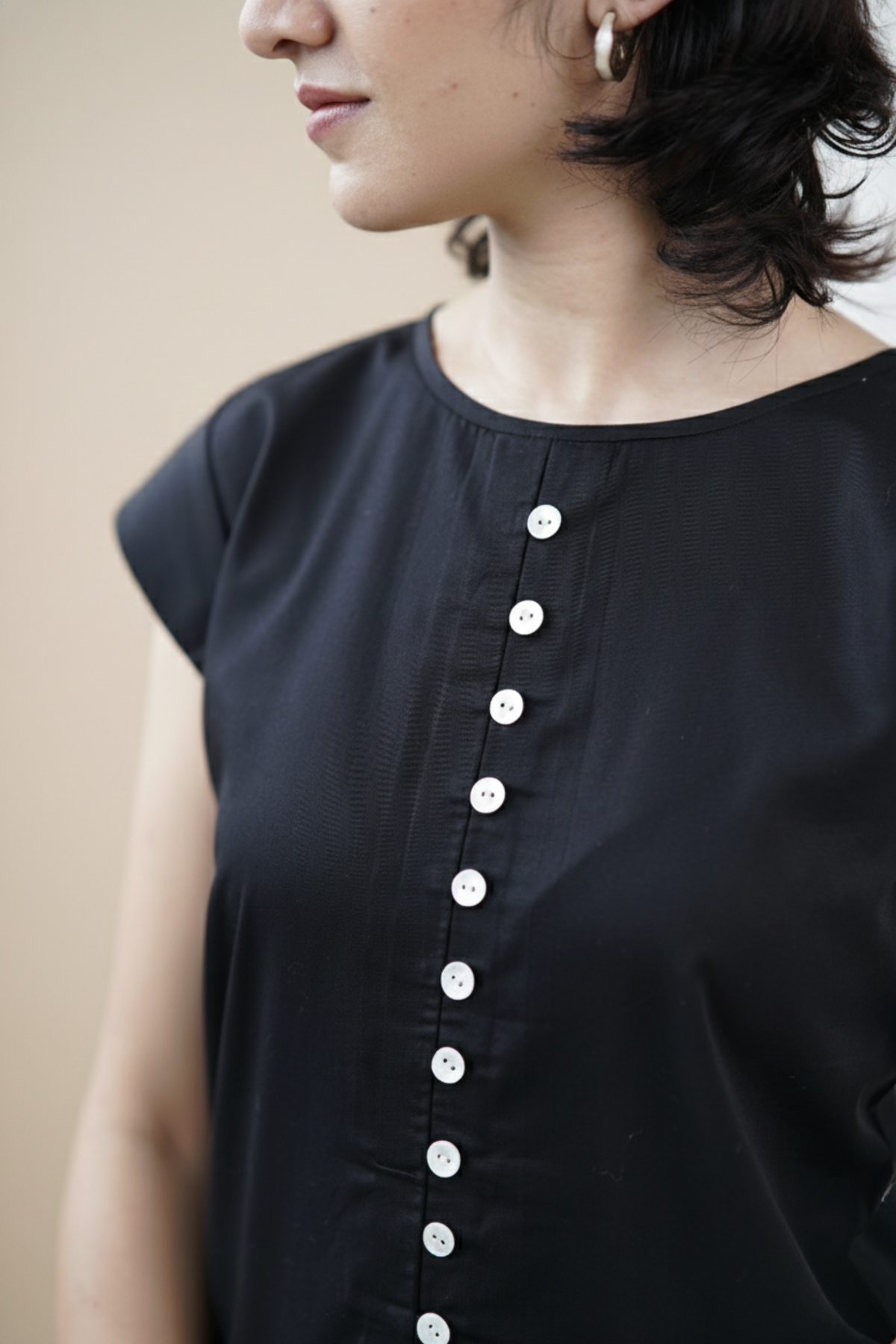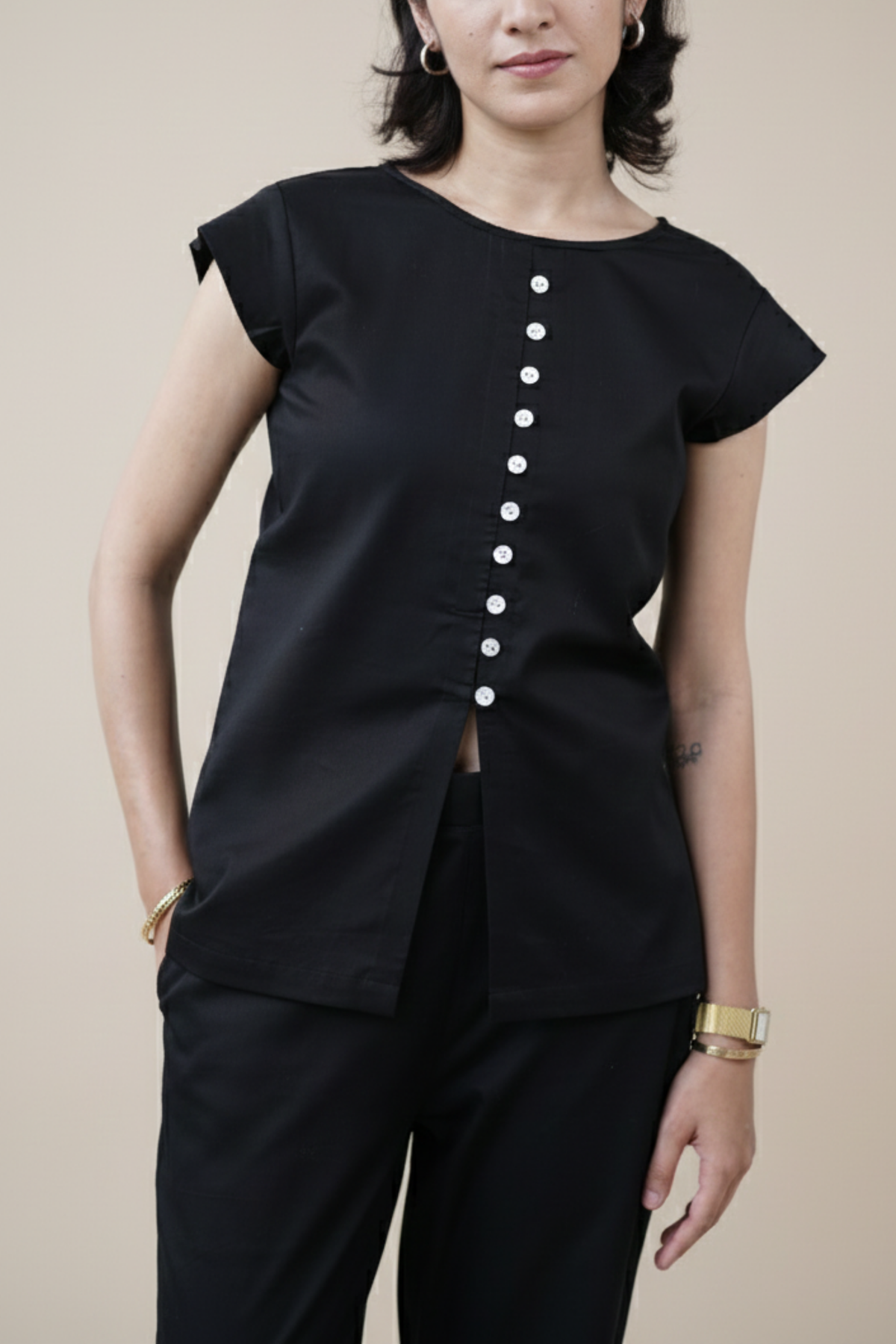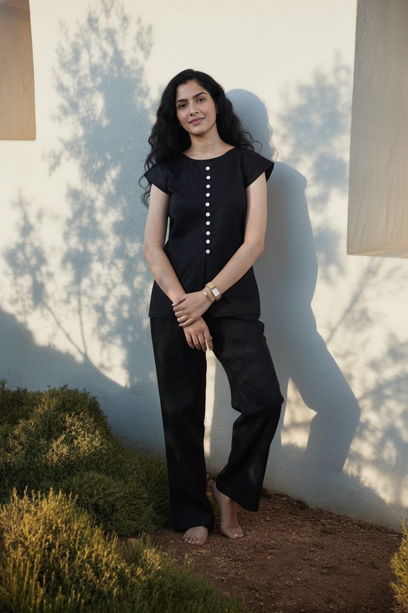 The Atrina Set is pared-back with a purposeful touch. Tailored in crisp black cotton poplin, the set includes a shell-button top with a small front slit at the hem and slim-fit trousers. A balance of clarity, structure, and quiet detail.