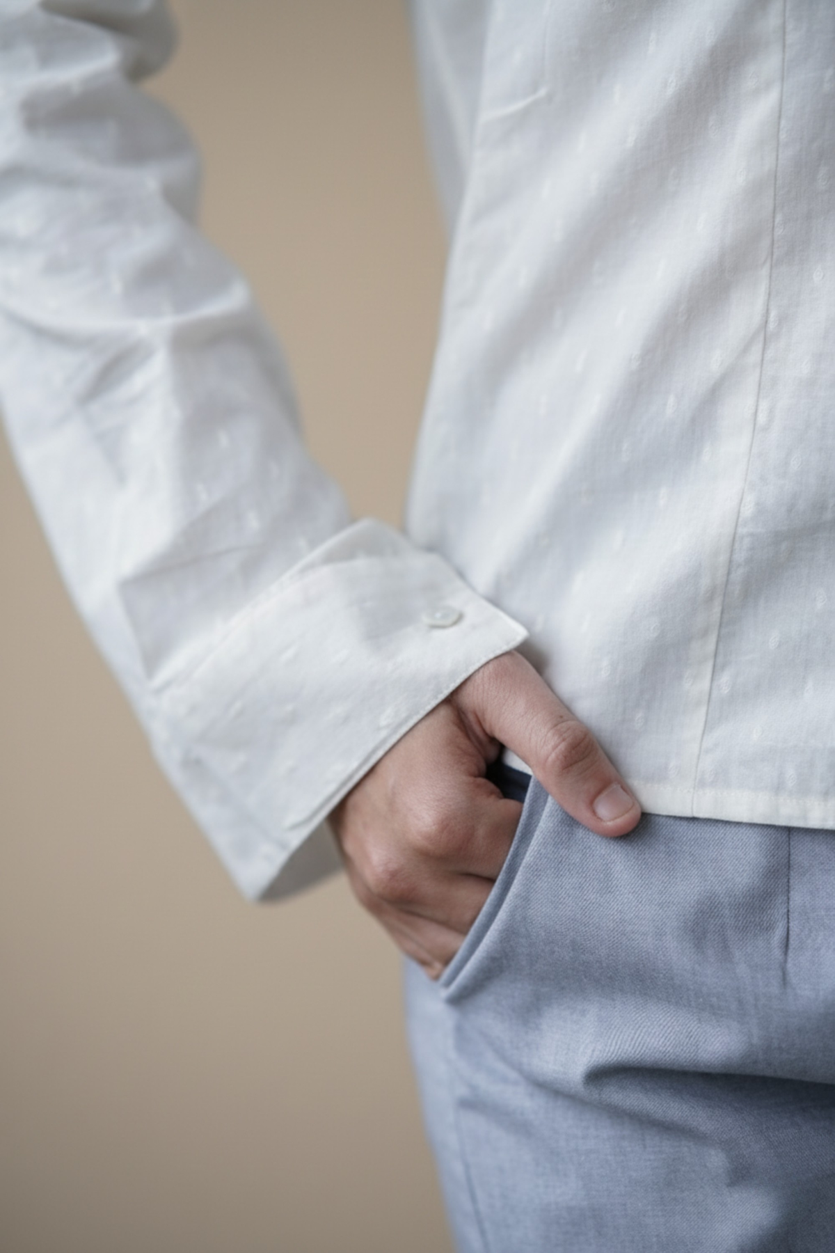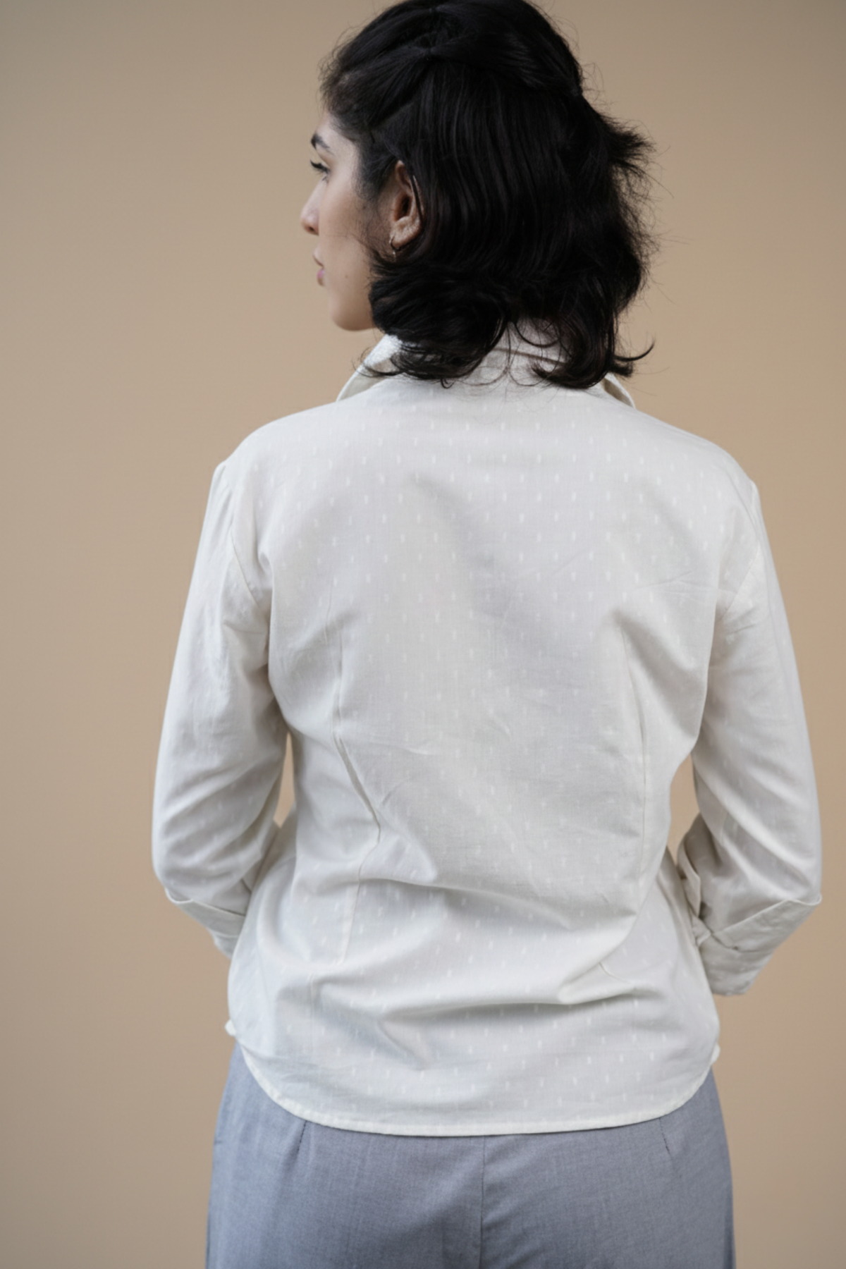 The Ivya Top blends tailoring with delicacy. Crafted from textured organic dobby cotton in soft ivory, it features corset-style paneling and a clean buttoned front. Full sleeves and a sharp collar add balance to its structured shape — elegant yet grounded.
