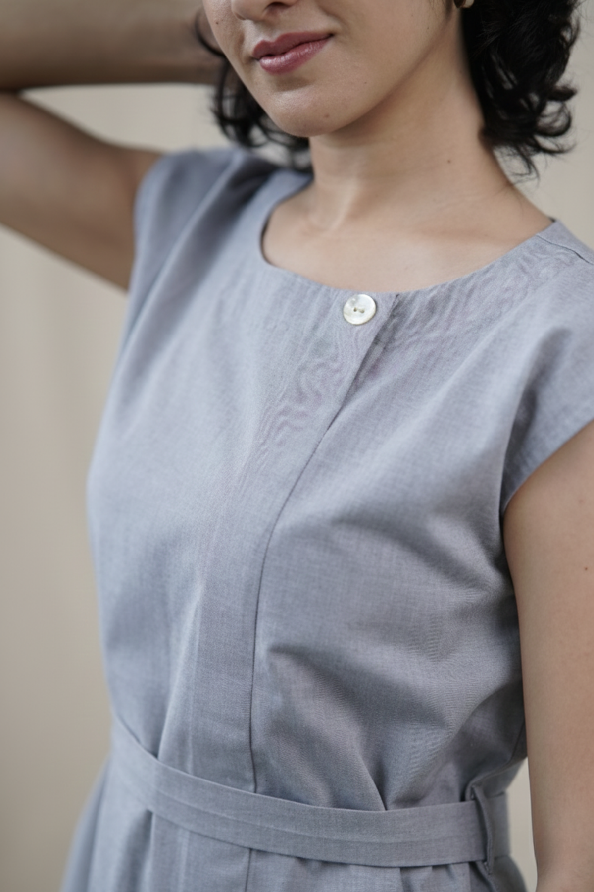 The Selden Set is calm and composed. Cut from breathable organic cotton twill in a muted grey-blue tone, it pairs a sleeveless belted top with straight trousers. Intentional in line and balanced in proportion — designed to adapt across moments.