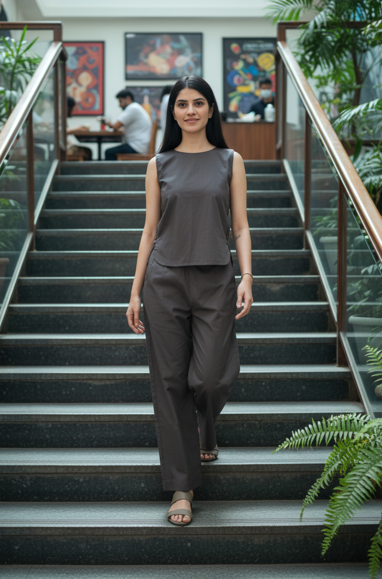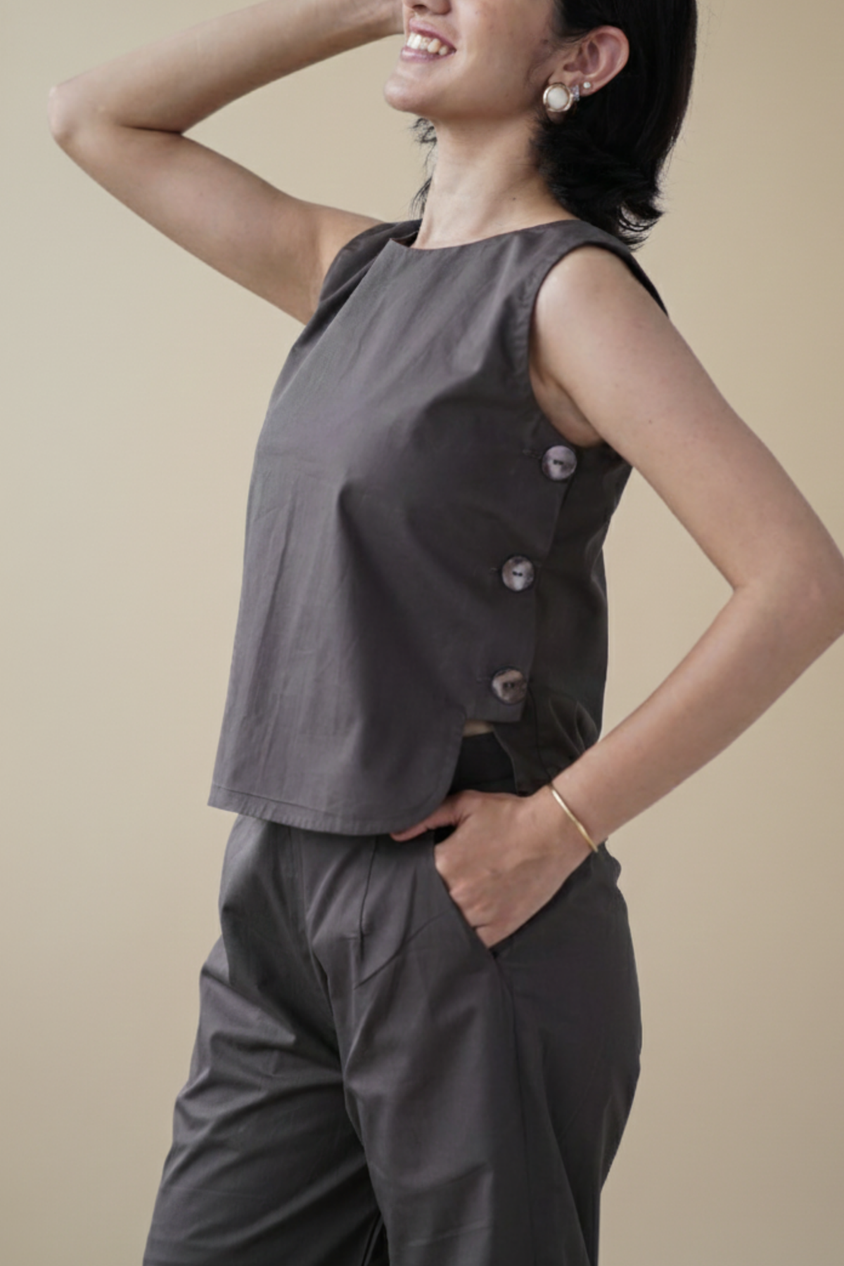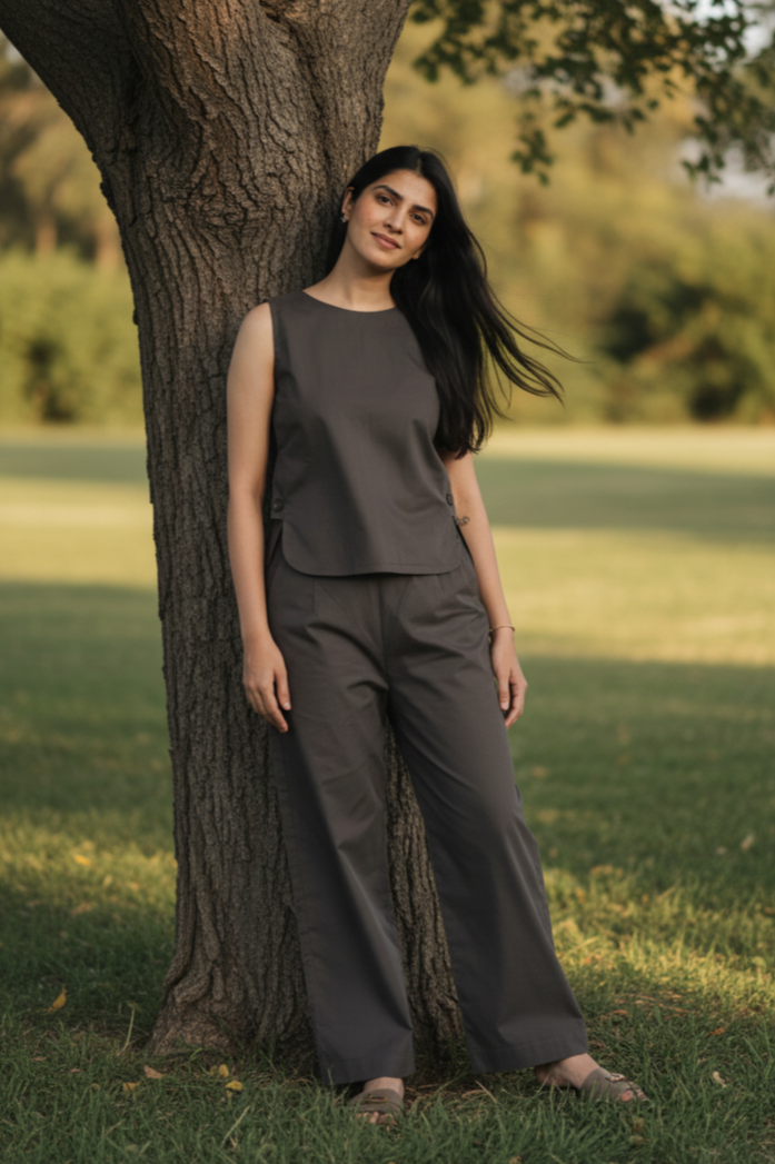 The Tosta Set brings quiet utility to soft tailoring. Made from crisp organic cotton poplin and finished in ash coffee, it features a co-ord silhouette with a side-button opening — functional, intentional, and minimal in expression.