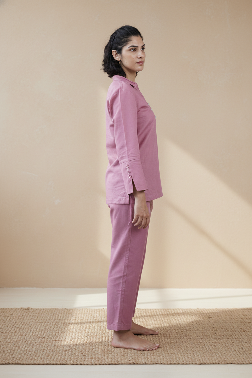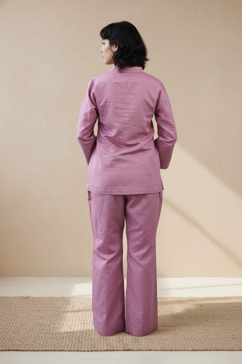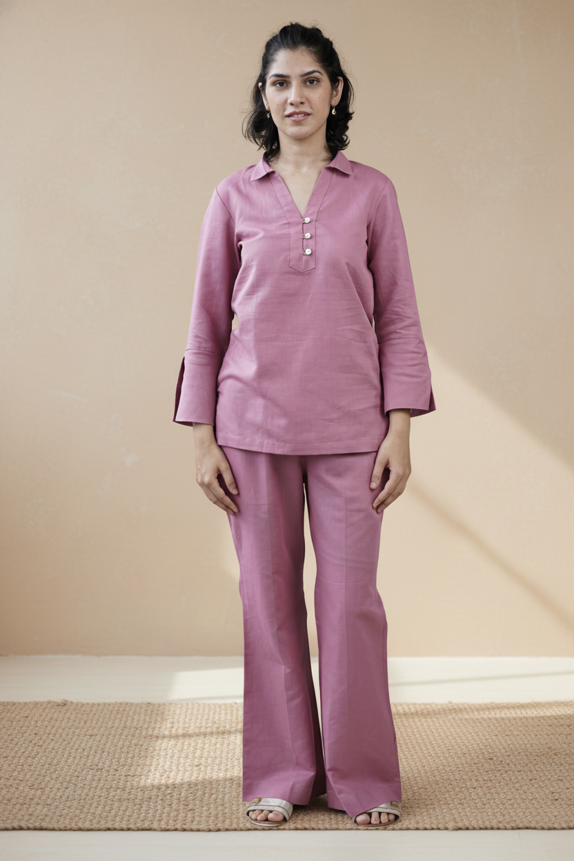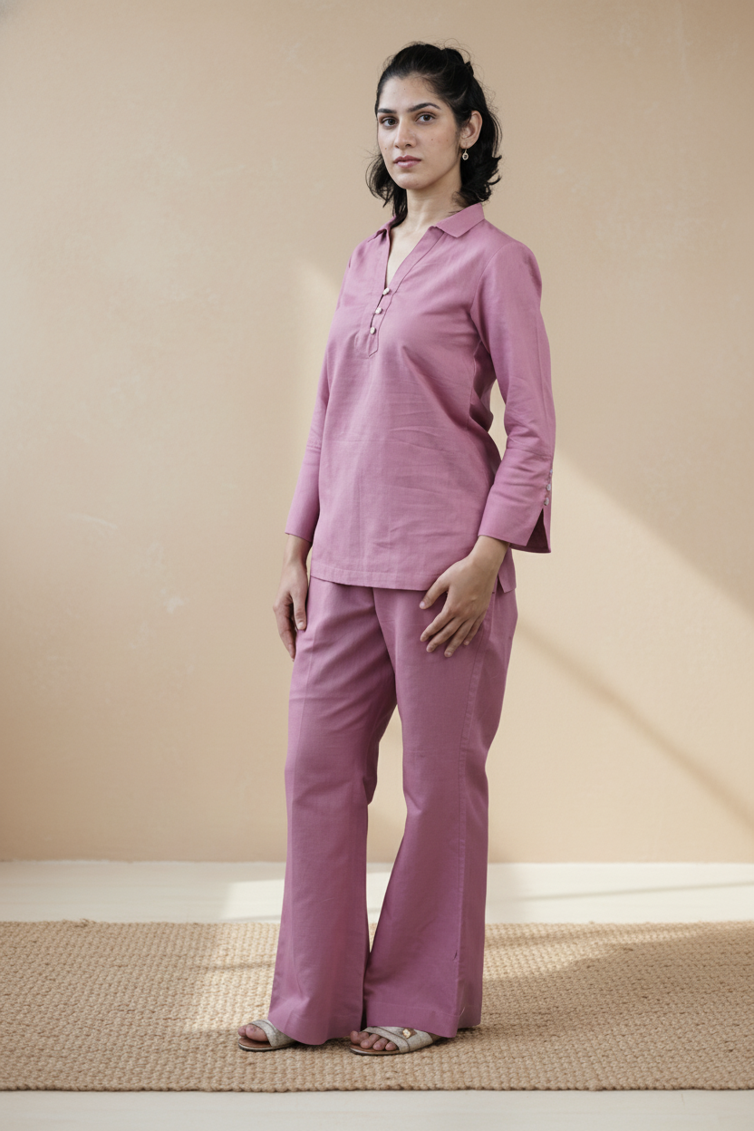 The Blayra Set is graceful without excess. Cut in a mauve-toned cotton-linen blend, the tunic-style top features button detailing at the neckline and sleeves. Bootcut trousers offer a clean line and ease of movement. A minimal set for deliberate days.