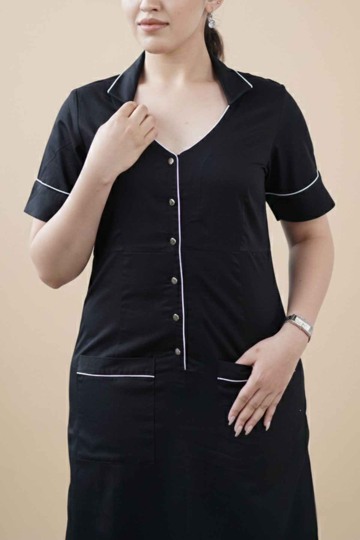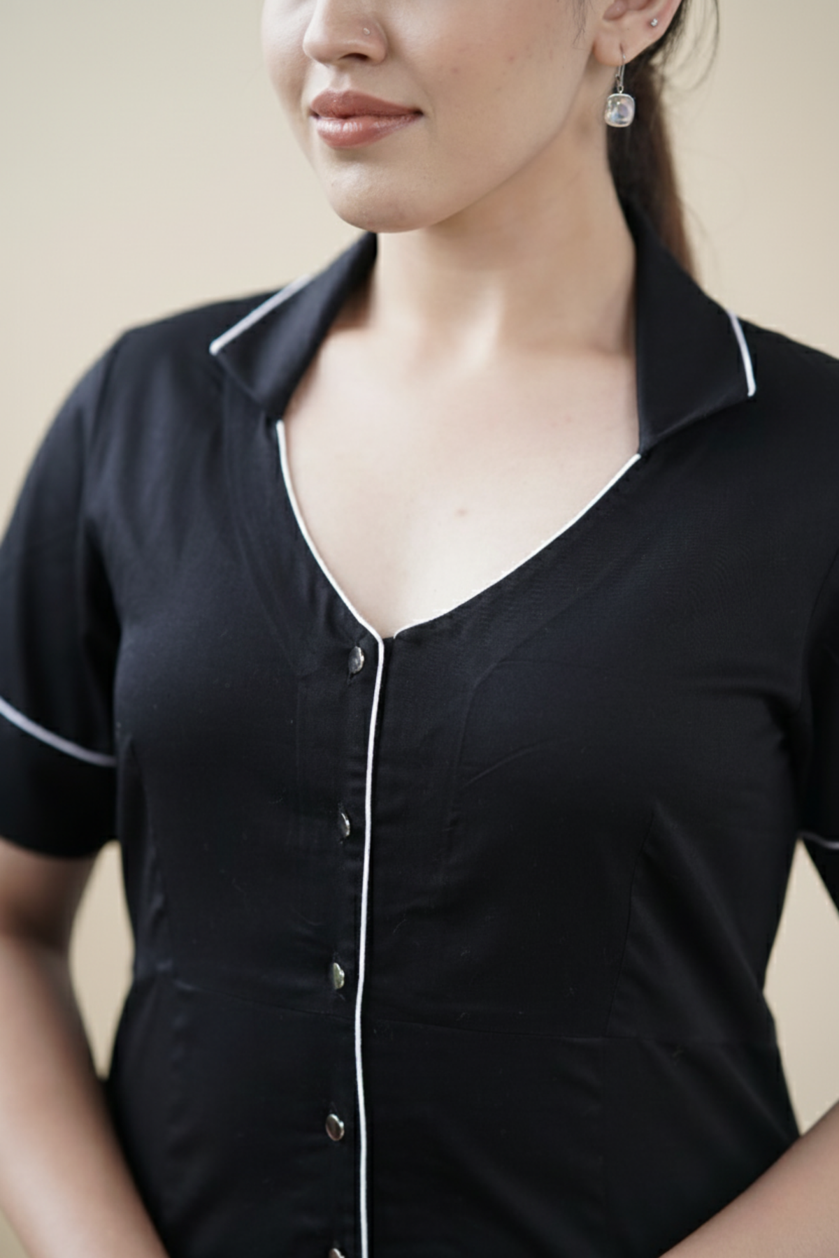 Black And White Edit Dress is structured with restraint. Made in soft organic poplin, it’s defined by a clean straight fit, open collar, and contrast piping at the edges. Designed for quiet distinction — pared back, precise, and versatile.