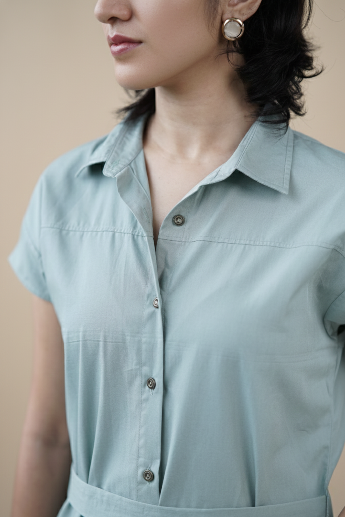 The Salvia Dress is both structured and serene. Made from breathable organic cotton poplin in soft sage green, it features a short-sleeved shirt silhouette, a crisp collar, and a clean belt to shape the waist. Front patch pockets ground it in subtle function.